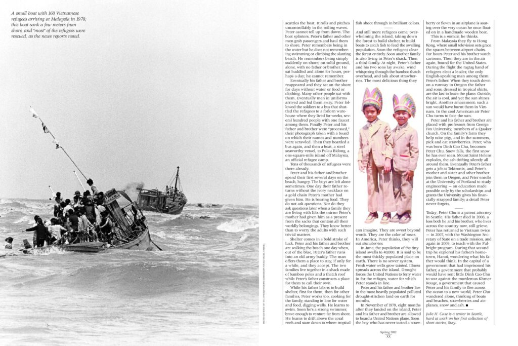 Today, Peter Chu is a patent attorney in Seattle. His father died in 2008, a loss both he and his brother, who lives across the country now, still grieve. Peter has returned to Vietnam twice — in 2007, with the Washington Secretary of State on a trade mission, and again in 2009, to teach with the Fulbright program. During that second trip he explored his father’s hometown, Hanoi, wondering what his father would think. In the capital of a government that had imprisoned his father, a government that probably would have sent little Dinh Cao Chu to war against the murderous Khmer Rouge, a government that caused Peter and his family to flee across the ocean to a new world, Peter Chu wandered alone, thinking of boats and beaches, strawberries and airplanes, snow and ash.
